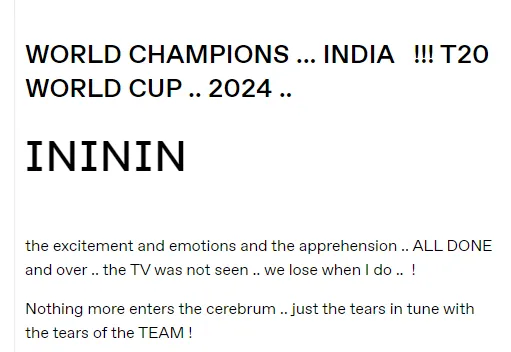 "ലോക ചാമ്പ്യന്മാർ... ഇന്ത്യ. ടി20 ലോകകപ്പ് 2024.. ആവേശം, വികാരം, ഭയം എല്ലാം കഴിഞ്ഞു. ടിവി കണ്ടില്ല.. മത്സരം കണ്ടാൽ നമുക്ക് കപ്പ് നഷ്ടപ്പെടുമോ എന്ന പോടി ഉണ്ടായിരുന്നു. തലയിലേക്ക് കൂടുതലായി ഒന്നും കയറുന്നില്ല. കണ്ണുനീർ മാത്രം," ബ്ലോഗ് പോസ്റ്റിൽ അമിതാഭ് ബച്ചൻ കുറിച്ചു.