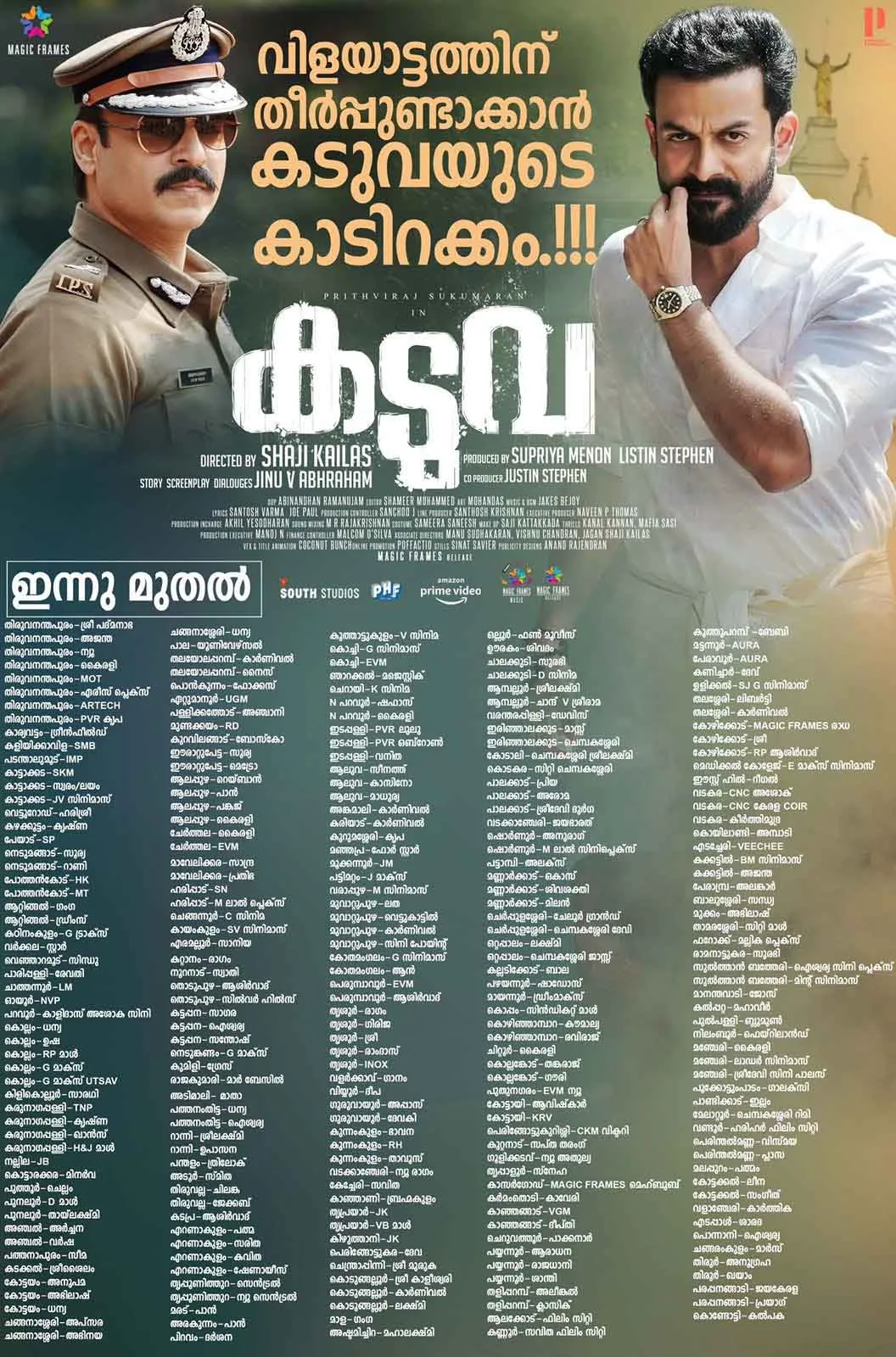 - 10:25 (IST) 07 Jul 2022'കടുവ'യുടെ കാടിറക്കം; തിയേറ്റര് ലിസ്റ്റ്