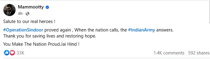 "നമ്മുടെ യഥാർത്ഥ നായകന്മാർക്ക് സല്യൂട്ട്. രാഷ്ട്രം വിളിക്കുമ്പോൾ ഇന്ത്യൻ ആർമി ഉത്തരം നൽകുമെന്ന് ഓപ്പറേഷൻ സിന്ദൂറിലൂടെ വീണ്ടും തെളിയിച്ചു. ജീവൻ സംരക്ഷിക്കുന്നതിനും പ്രതീക്ഷ പുനഃസ്ഥാപിക്കുന്നതിനും നന്ദി. നിങ്ങൾ രാജ്യത്തെ അഭിമാനപൂരിതമാക്കുന്നു. ജയ് ഹിന്ദ്," മമ്മൂട്ടിയുടെ കുറിപ്പ് ഇങ്ങനെ.
