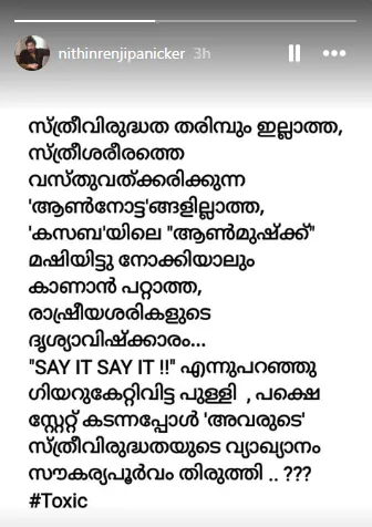 സ്റ്റേറ്റ് കടന്നപ്പോള് അവരുടെ സ്ത്രീവിരുദ്ധതയുടെ വ്യാഖ്യാനം സൗകര്യപൂര്വ്വം തിരുത്തിയെന്ന്, നിഥിൻ സോഷ്യൽ മീഡിയയിൽ കുറിച്ചു. "സ്ത്രീവിരുദ്ധത തരിമ്പും ഇല്ലാത്ത, സ്ത്രീശരീരത്തെ വസ്തുവത്കരിക്കുന്ന 'ആണ്നോട്ട'ങ്ങളില്ലാത്ത, 'കസബ'യിലെ "ആണ്മുഷ്ക്ക്" മഷിയിട്ടു നോക്കിയാലും കാണാന് പറ്റാത്ത, രാഷ്ട്രീയ ശരികളുടെ ദൃശ്യാവിഷ്കാരം. "സേ ഇറ്റ്, സേ ഇറ്റ്"!! എന്ന് പറഞ്ഞ് ​ഗിയര് കേറ്റിവിട്ട പുള്ളി. പക്ഷേ സ്റ്റേറ്റ് കടന്നപ്പോള് 'അവരുടെ' സ്ത്രീവിരുദ്ധതയുടെ വ്യാഖ്യാനം സൗകര്യപൂര്വ്വം തിരുത്തി?" നിഥിൻ കുറിച്ചു.