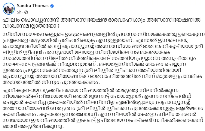 മലയാള സിനിമക്ക് ദോഷം ചെയ്യുന്ന ഇത്തരം പ്രസ്താവനകൾ നടത്തുന്ന ശ്രീ ലിസ്റ്റിൻ സ്റ്റീഫനെ അടിയന്തിരമായി പ്രൊഡ്യൂസഴ്സ് അസോസിയേഷന്റെ ഭാരവാഹിത്തത്തിൽ നിന്ന് മാത്രമല്ല പ്രാഥമിക അംഗത്വത്തിൽ നിന്നും പുറത്താക്കണം. എനിക്കുണ്ടായ വ്യക്തിപരമായ വിഷയത്തിൽ രാജ്യത്തു നിലനിൽക്കുന്ന നിയമങ്ങൾക്ക് വിധേയമായി ഞാൻ മുന്നോട്ട് പോയപ്പോൾ എന്നെ സസ്പെൻഡ് ചെയ്യാൻ കാണിച്ച (കോടതിയിൽ നിലനിന്നില്ല എങ്കിൽപ്പോലും) പ്രൊഡ്യൂസഴ്സ് അസോസിയേഷൻ നേതൃത്വം ശ്രീ ലിസ്റ്റിൻ സ്റ്റീഫനെ പുറത്താക്കാനുള്ള ആർജ്ജവം കാണിക്കണം. കൂടാതെ ഉന്നതബോഡി എന്ന നിലയിൽ കേരളാ ഫിലിം ചേംബർ സ്വമേധയാ ഈ വിഷയത്തിൽ ഇടപെട്ട് ഉചിതമായ നടപടികൾ സ്വീകരിക്കണമെന്ന് ഞാൻ അഭ്യർത്ഥിക്കുന്നു," - സാന്ദ്രാ തോമസ്.