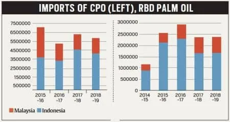 2018-19ൽ 64.15 ലക്ഷം മെട്രിക് ടൺ സിപിഒയും (അസംസ്കൃത പാമോയിൽ) 23.9 ലക്ഷം മെട്രിക് ടൺ ആർബിഡി ഓയിലുമാണ് (റിഫെെന്ഡ് ആൻഡ് ബ്ലീച്ച്ഡ് ഓയിൽ) ഇന്ത്യ ഇറക്കുമതി ചെയ്തത്. ഏറ്റവും കൂടുതൽ ഇന്ത്യ ഇറക്കുമതി ചെയ്തത് ഇന്തോനേഷ്യയിൽ നിന്നാണ്. കൂടിയ താപനിലയിലും ഇത്തരം എണ്ണകൾ സ്ഥിരത പുലർത്തുന്നതിനാലാണ് ഇന്ത്യ ഇത്രയും അളവിൽ എണ്ണ ഇറക്കുമതി ചെയ്യുന്നത്.