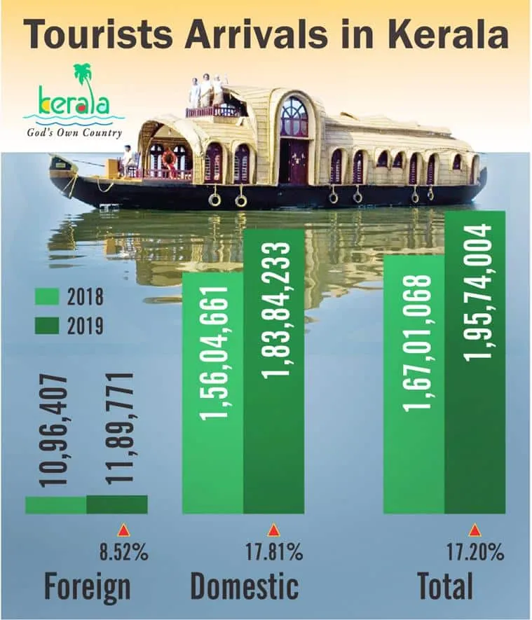 2019 ൽ മാത്രം 1.96 കോടി ആഭ്യന്തര, വിദേശ സഞ്ചാരികളാണ് കേരളത്തിന്റെ ഭംഗി ആസ്വദിക്കാൻ എത്തിയത്. 2018 ൽ ഇത് 1.67 കോടിയായിരുന്നു. ഇതിൽ തന്നെ വിദേശ സഞ്ചാരികളുടെ എണ്ണത്തിൽ മുൻ വർഷത്തേക്കാൾ വർധനവ് ഉണ്ട്. തുടർച്ചയായുണ്ടായ പ്രളയത്തിൽ നിന്നു കേരളത്തിന്റെ വിനോദ സഞ്ചാര മേഖല കരകയറിയതിന്റെ ലക്ഷണമാണ് ഇപ്പാേൾ പുറത്തുവന്നിരിക്കുന്ന കണക്കുകൾ. വിനോദ സഞ്ചാര മേഖലയ്ക്ക് ഇപ്പോഴത്തെ സർക്കാർ കൂടുതൽ പ്രാധാന്യം നൽകുന്നുണ്ട്.