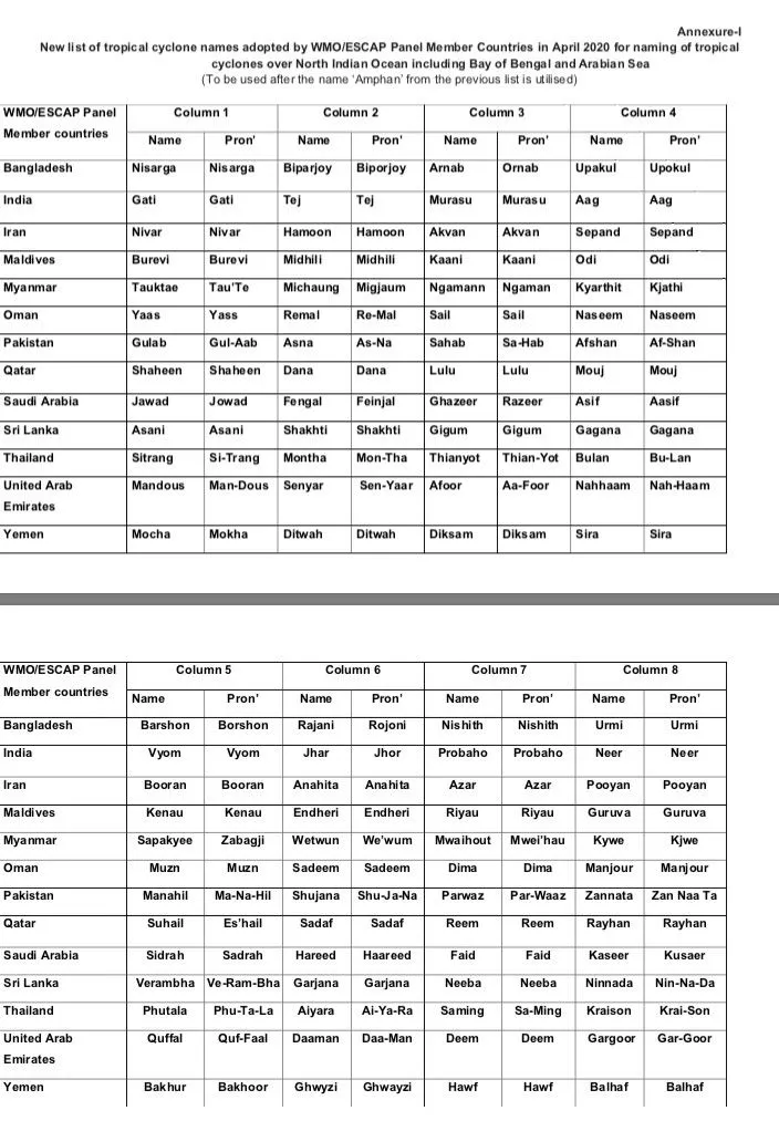ചുഴലിക്കാറ്റുകൾക്ക് പേരിടാൻ കൃത്യമായ മാർഗനിർദേശമുണ്ട്. ഓരോ രാജ്യത്തിനും തോന്നുന്ന പോലെ പേരിടാൻ സാധിക്കില്ല. രാഷ്ട്രീയം, മതം, സംസ്കാരം എന്നിവയുമായി ബന്ധമില്ലാത്ത നിഷ്പക്ഷ പേരുകൾ ആയിരിക്കണം കണ്ടെത്തേണ്ടത്. സമൂഹത്തിൽ ആ പേര് മൂലം സ്പർദ്ധയുണ്ടാകരുത്. ആരുടെയും വികാരങ്ങൾ വൃണപ്പെടുത്തുന്നത് ആയിരിക്കരുത്. ക്രൂരമായ, വിദ്വേഷജനകമായ പേരുകൾ ആയിരിക്കരുത്. ഒരിക്കൽ ഉപയോഗിച്ച പേര് പിന്നീട് ഉപയോഗിക്കരുത്. പരമാവധി എട്ട് അക്ഷരങ്ങളിൽ പേര് ഒതുക്കണം. നൽകുന്ന പേരിന്റെ ഉച്ചാരണം കൃത്യമായി നൽകണം. ആളുകൾക്ക് ഉച്ചരിക്കാൻ എളുപ്പമുള്ള പേര് ആയിരിക്കണം.