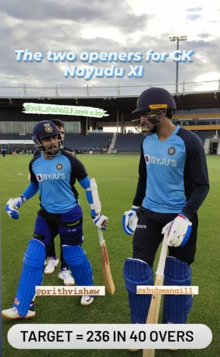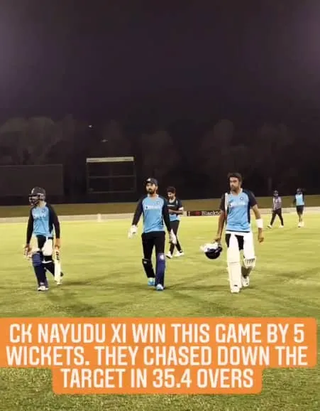 മറുപടി ബാറ്റിങ്ങിൽ നായകൻ കോഹ്ലിയുടെ കരുത്തിൽ സി.കെ.നായിഡു ഇലവൻ അനായാസ വിജയം സ്വന്തമാക്കി. 26 പന്തുകൾ ശേഷിക്കെ വെറും അഞ്ച് വിക്കറ്റ് മാത്രം നഷ്ടപ്പെടുത്തി കോഹ്ലിപ്പട ലക്ഷ്യംകണ്ടു. 58 പന്തിൽ നിന്ന് 91 റൺസ് നേടിയ കോഹ്ലി മികച്ച പ്രകടനം കാഴ്ചവച്ചു. പൃഥ്വി ഷാ, ശുഭ്മാൻ ഗിൽ എന്നിവരായിരുന്നു കോഹ്ലിയുടെ ടീമിലെ ഓപ്പണർമാർ.