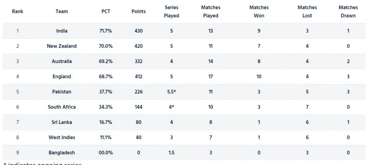 നിലവിൽ ടെസ്റ്റ് ചാംപ്യൻഷിപ്പ് പോയിന്റ് പട്ടികയിൽ ഒന്നാം സ്ഥാനത്ത് ഇന്ത്യയാണ്. 71.7 ശരാശരിയോടെ 430 പോയിന്റ് ഇന്ത്യയ്ക്കുണ്ട്. എന്നാൽ, ഇംഗ്ലണ്ടിനെതിരായ ടെസ്റ്റ് പരമ്പര ആരംഭിക്കാനിരിക്കുകയാണ്. ഈ പരമ്പരയുടെ ഫലം ഇന്ത്യയുടെ മുന്നോട്ടുള്ള യാത്രയെ സ്വാധീനിക്കും. 4-0, 3-0, 3-1, 2-0, 2-1 എന്നീ നിലകളിൽ ടെസ്റ്റ് പരമ്പര സ്വന്തമാക്കിയാൽ മാത്രമേ ഇന്ത്യയ്ക്ക് ടെസ്റ്റ് ചാംപ്യൻഷിപ്പ് ഫൈനലിൽ പ്രവേശിക്കാൻ സാധിക്കൂ.