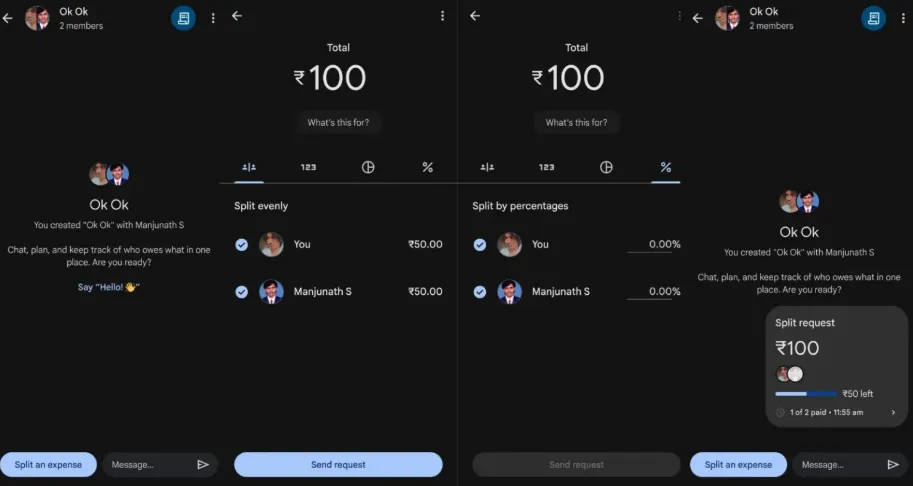 - സ്പ്ലിറ്റ് എക്സ്പെൻസിൽ മൊത്തം ബിൽ തുക നൽകി റിക്വസ്റ്റ് സെൻഡ് ചെയ്യുക. ആപ്പ് സ്വയം തുക വിഭജിച്ച് ഗ്രൂപ്പിലുള്ളവർക്ക് റിക്വസ്റ്റ് അയക്കും. ഇവിടെ മറ്റുള്ളവർക്ക് തുക അയക്കാം.